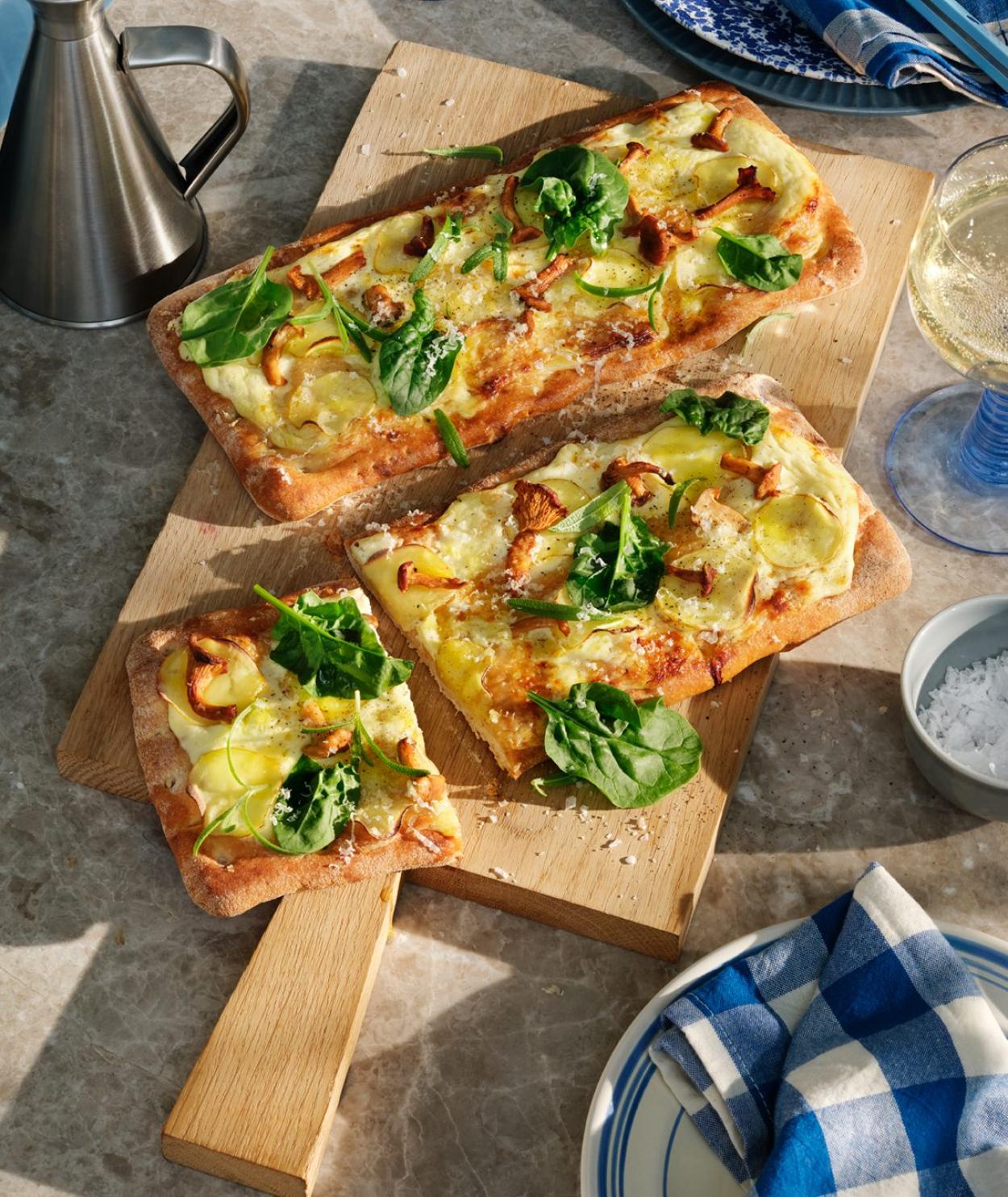 - Lägg ut potatisen, kantarellerna och ringla över lite olivolja, salta och peppra.