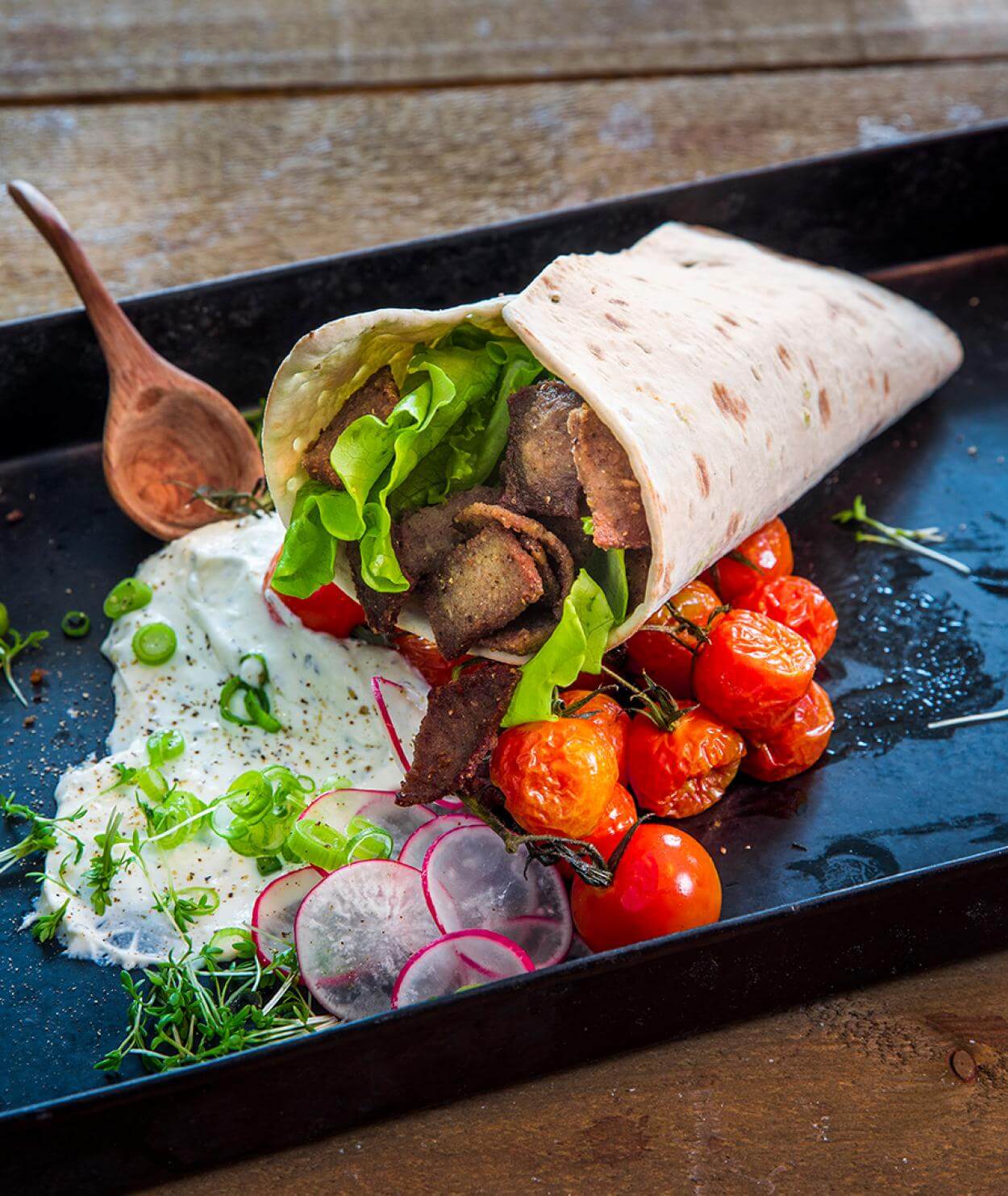 - Fyll bröden med salladsblad, kebabkött och yoghurtsås och rulla ihop till en rulle eller wrap.