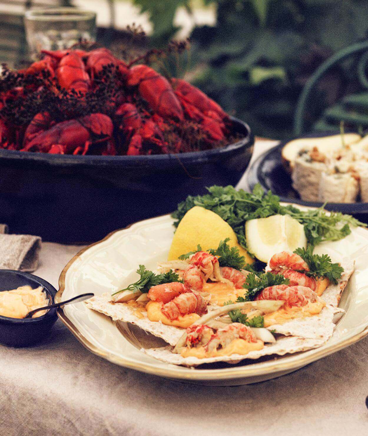 - Fördela aioli och kräftstjärtar på små snittar som du brutit i lagom stora munsbitar.