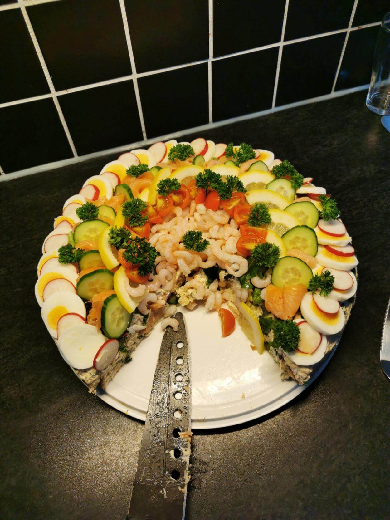 - Rör ihop och smaka av med salt och svartpeppar. Bred på mellan alla lagren. Gärna dagen innan så blir den saftigare. Garnera med ägg, rökt lax, räkor, gurka, tomat, rädisor, ärtskott eller vad du gillar. Gör mycket! Försvinnande god.