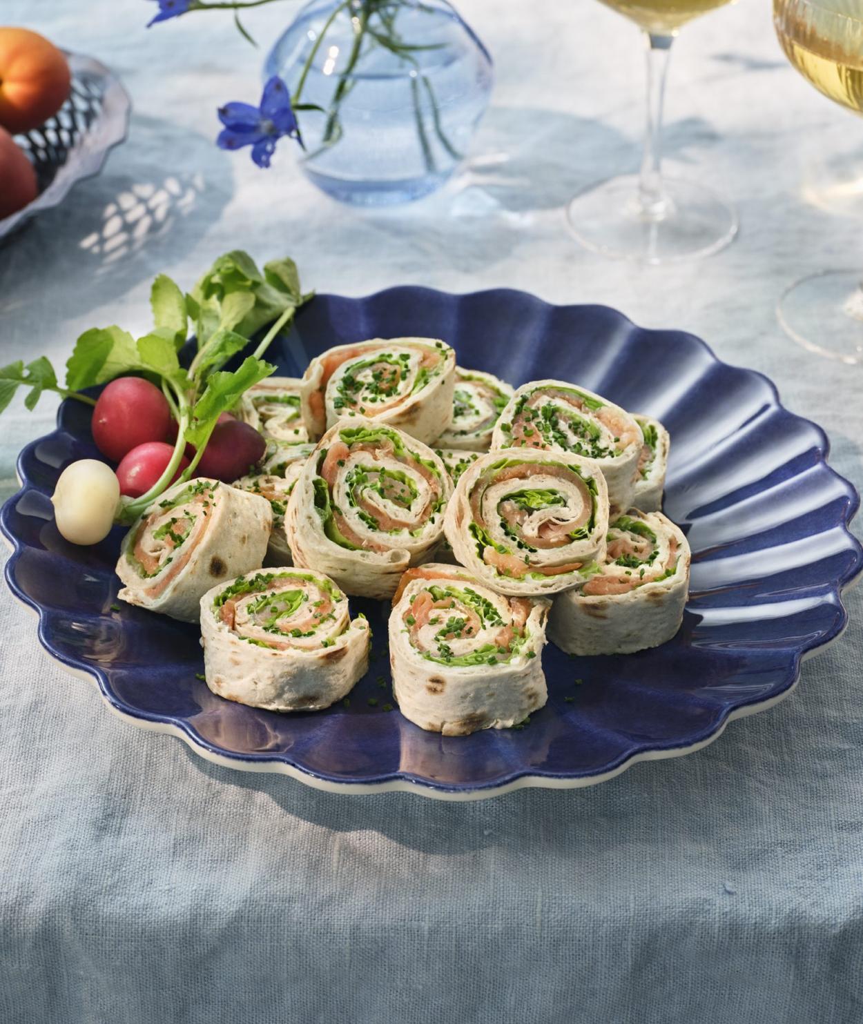 - Rulla ihop brödet från sidan med fyllning så fäster färskosten bra på slutet.