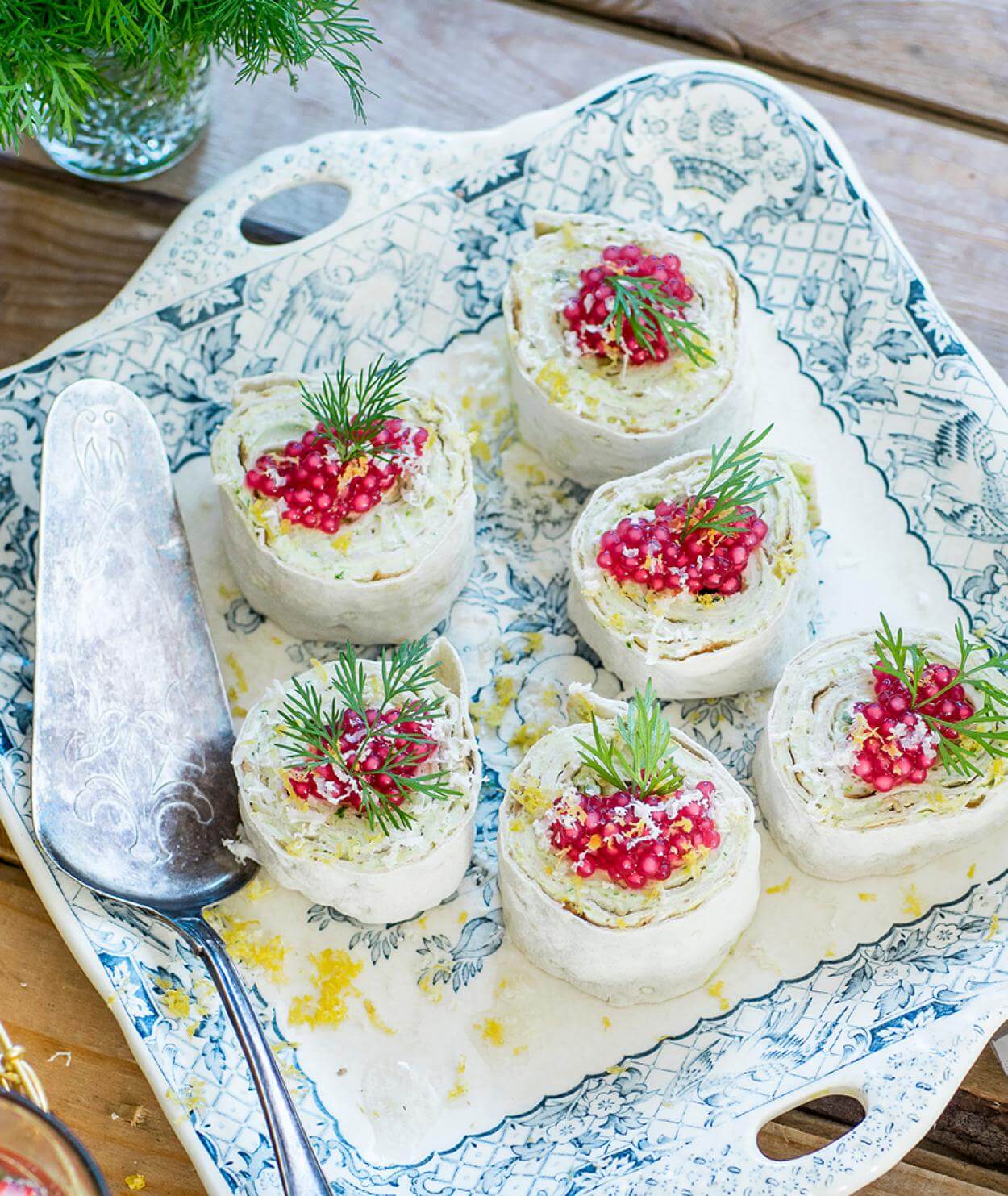 - Lägg på grönsaksstrimlor och rulla ihop. Skär i 6-7 bitar. Gör likadant med resterande brödskivor.