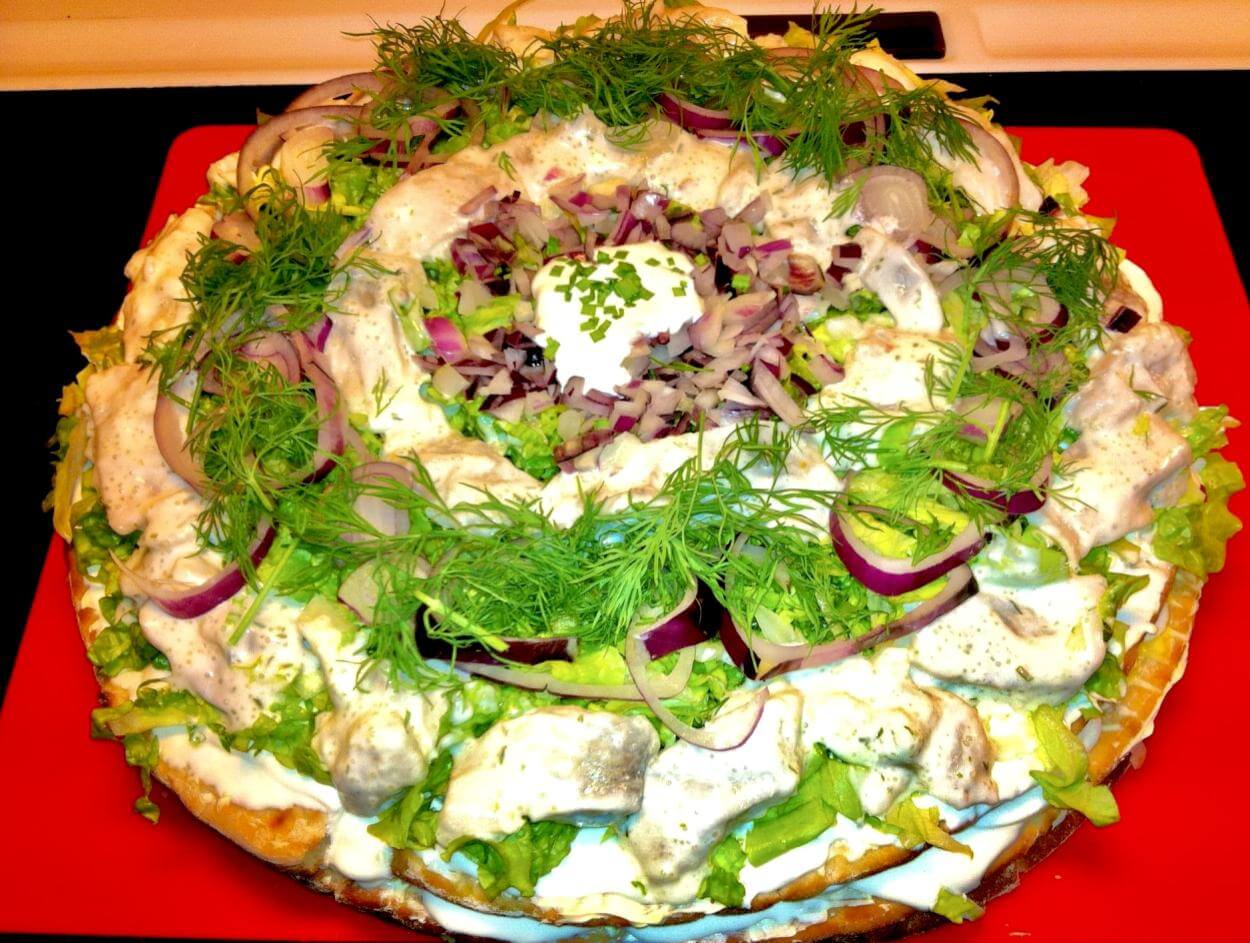 - Lägg på de sista två brödskivorna, bred över majonnäs och täck med hackad grönsallad. Lägg den inlagda sillen som en yttre ring på tårtan. Gör sedan en mellanring av senapssillen och lägg slutligen tomatsillen i mitten. Garnera med finhackad gräslök, ringar av rödlök och dillvippor. Gör gärna i ordning tårtan en dag innan den ska ätas. Då blir den saftig och god!