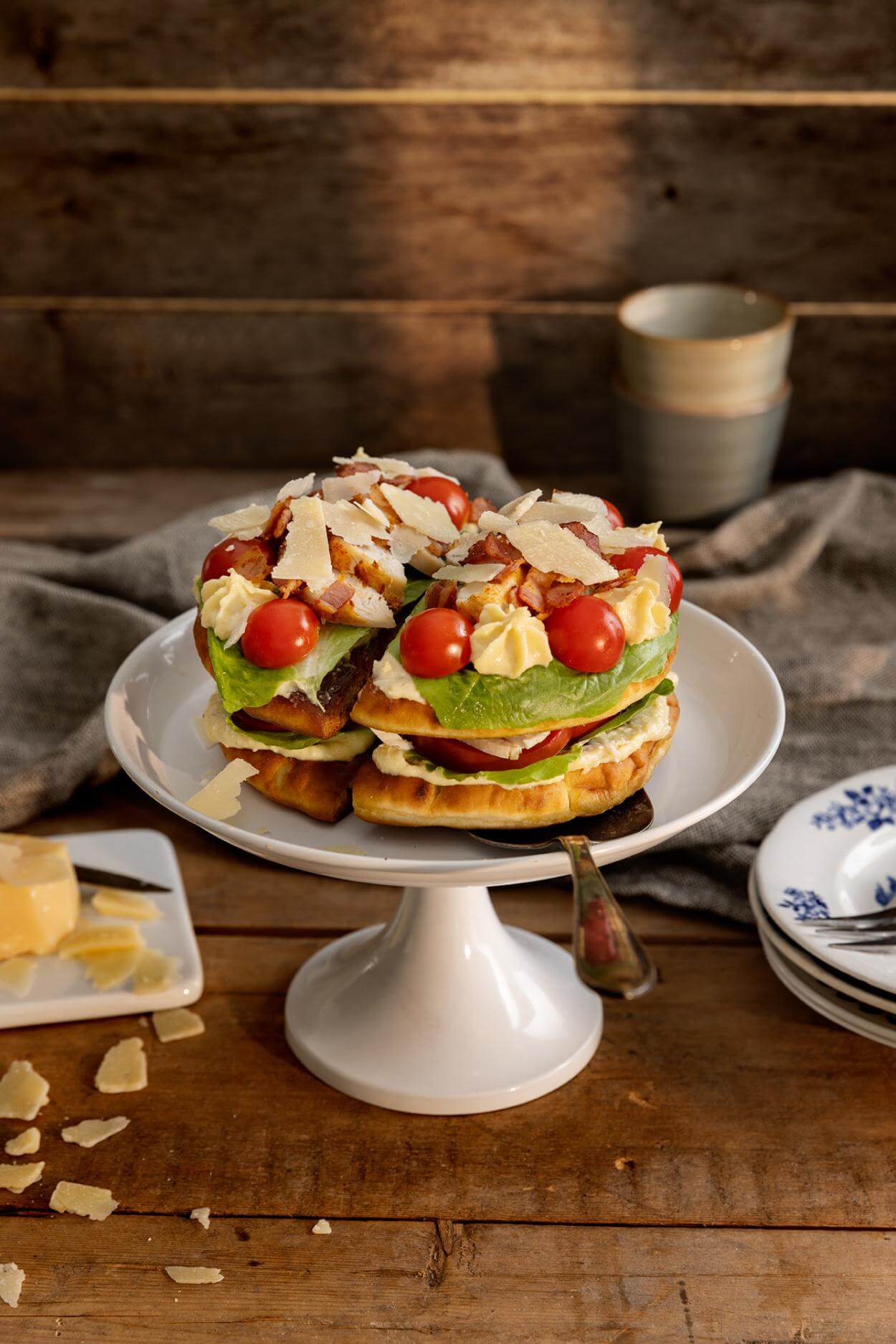 - Lägg på sallad, resten av kycklingen och cocktailtomaterna. Spritsa eller klicka ut det sista av krämen och toppa med bacon och hyvlad parmesanosten.