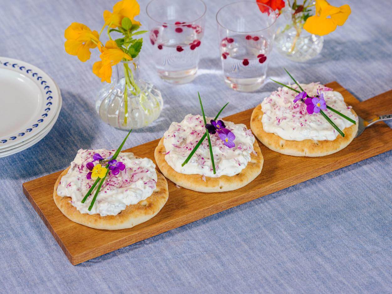 - Fördela sillröran på fyra brödskivor och dekorera med hackad rödlök, gräslöksstrån och gärna några ätbara blommor.