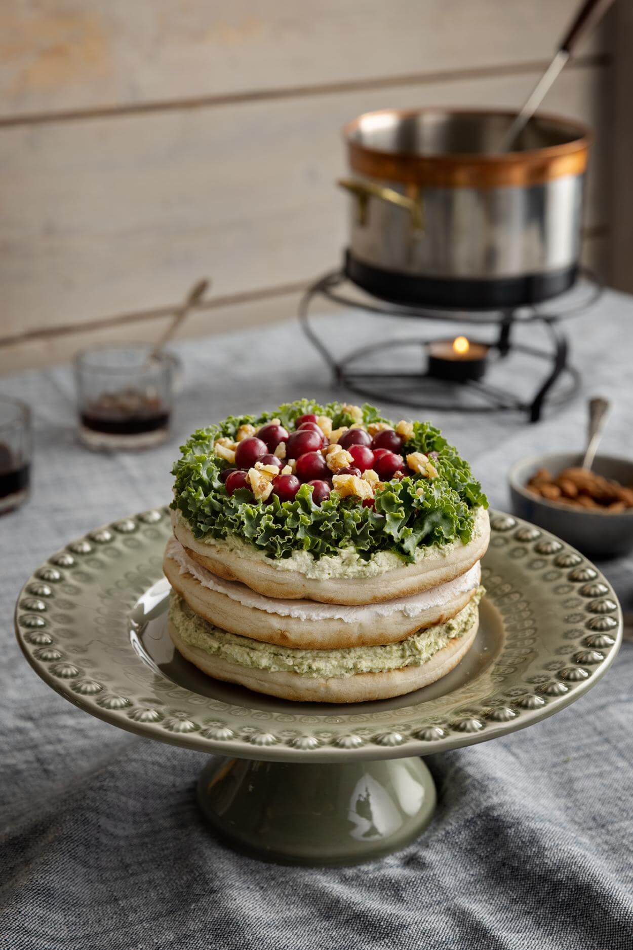 - Toppa med resten av pestokrämen och dekorera med färsk grönkål, tranbär och hackade valnötter.