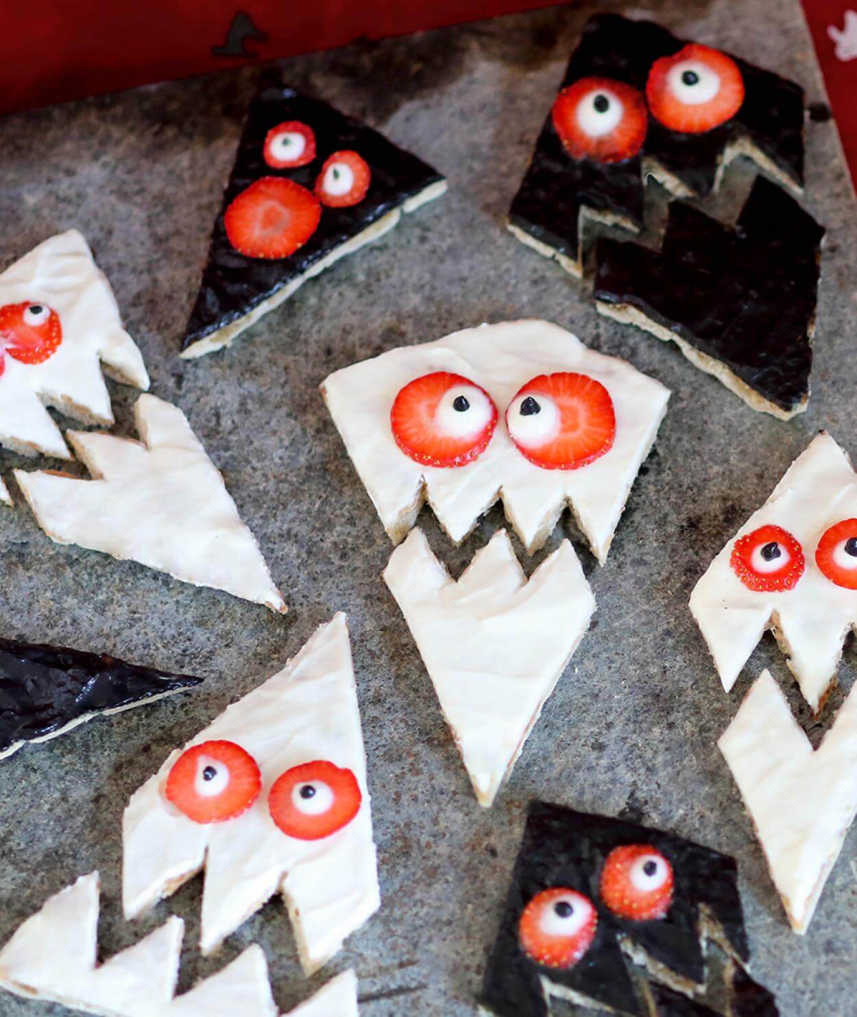 - Den vita toppingen blir ögonvitor och den svarta blir pupiller. Använd tandpetare eller baksidan av en tesked för att forma ögonen. Ögonen kan förberedas en stund innan för att sedan läggas på mackorna precis innan serveringen.