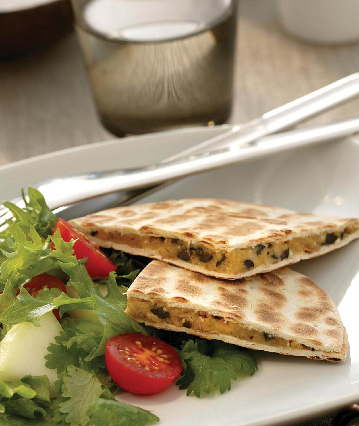 - Skär varje Quesadilla i fyra bitar och servera tillsammans med salladen.
