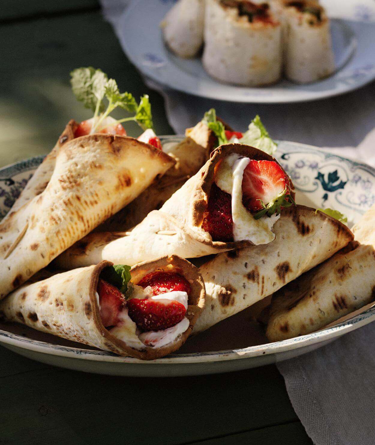 - Fyll strutarna med vispad grädde, jordgubbar och jordnötter. Alternativt byt ut grädde mot grekisk yoghurt. Ringla över lite honung och dekorera med citronmeliss.
