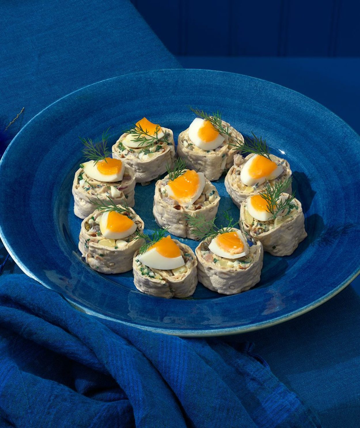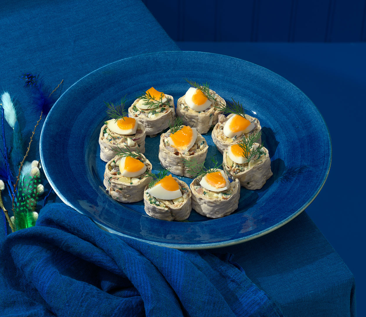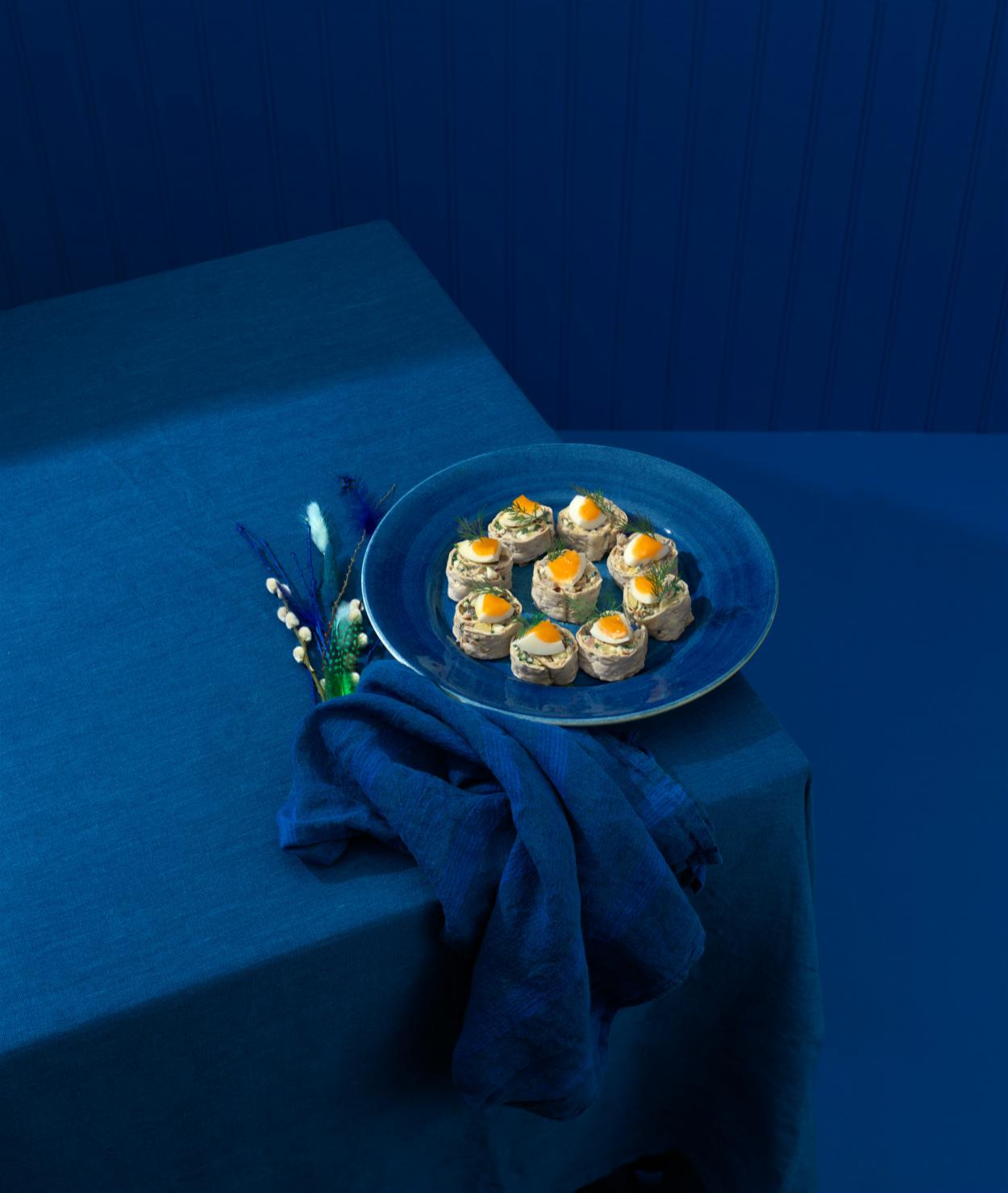 - Skär upp rullarna i bitar och lägg ut på ett fat. Garnera med en bit ägg och lite dill. Redo att serveras!
