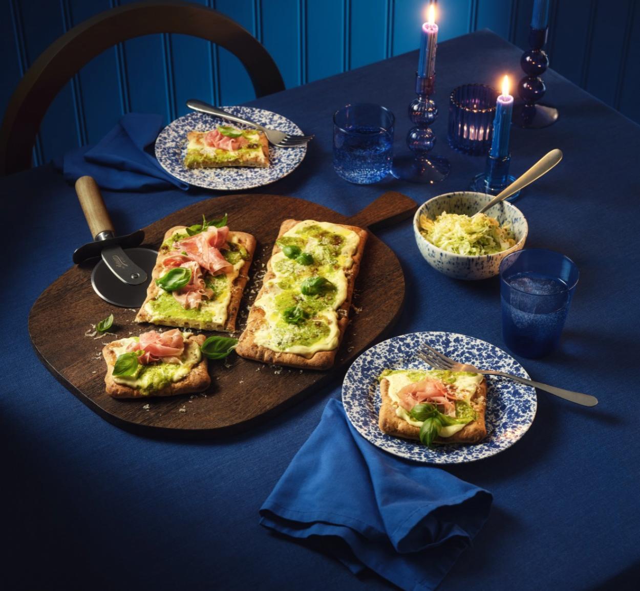 Pinsa med örtcrème, västerbottenost och parmaskinka