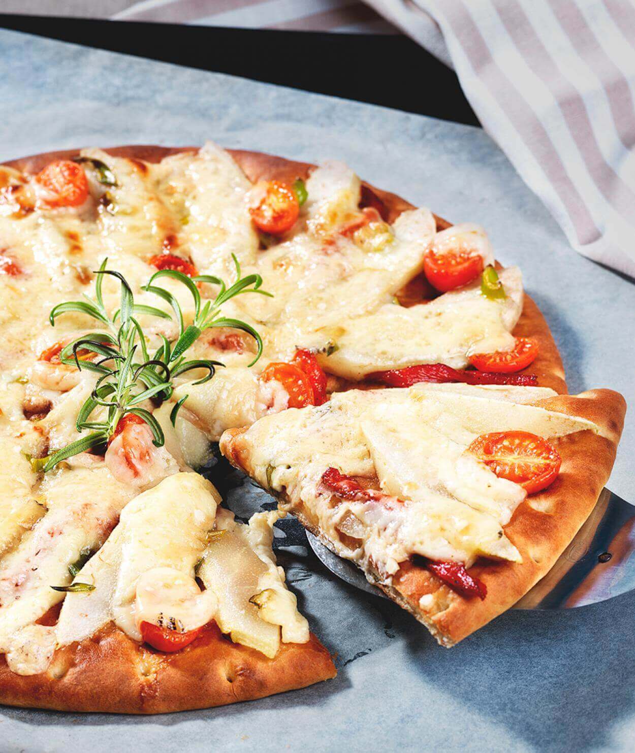 - Fördela päron, paprika och tomatskivor över pizzan och toppa med salladslök.