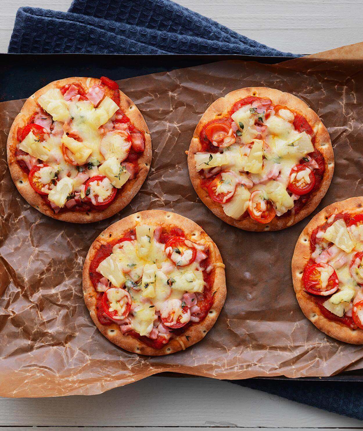 - Halvera tomaterna och dela ananasringarna och fördela ut på bröden.