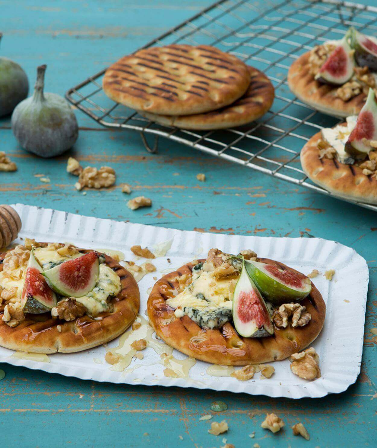 - Dela fikonen i kvartar och lägg två på varje bröd.