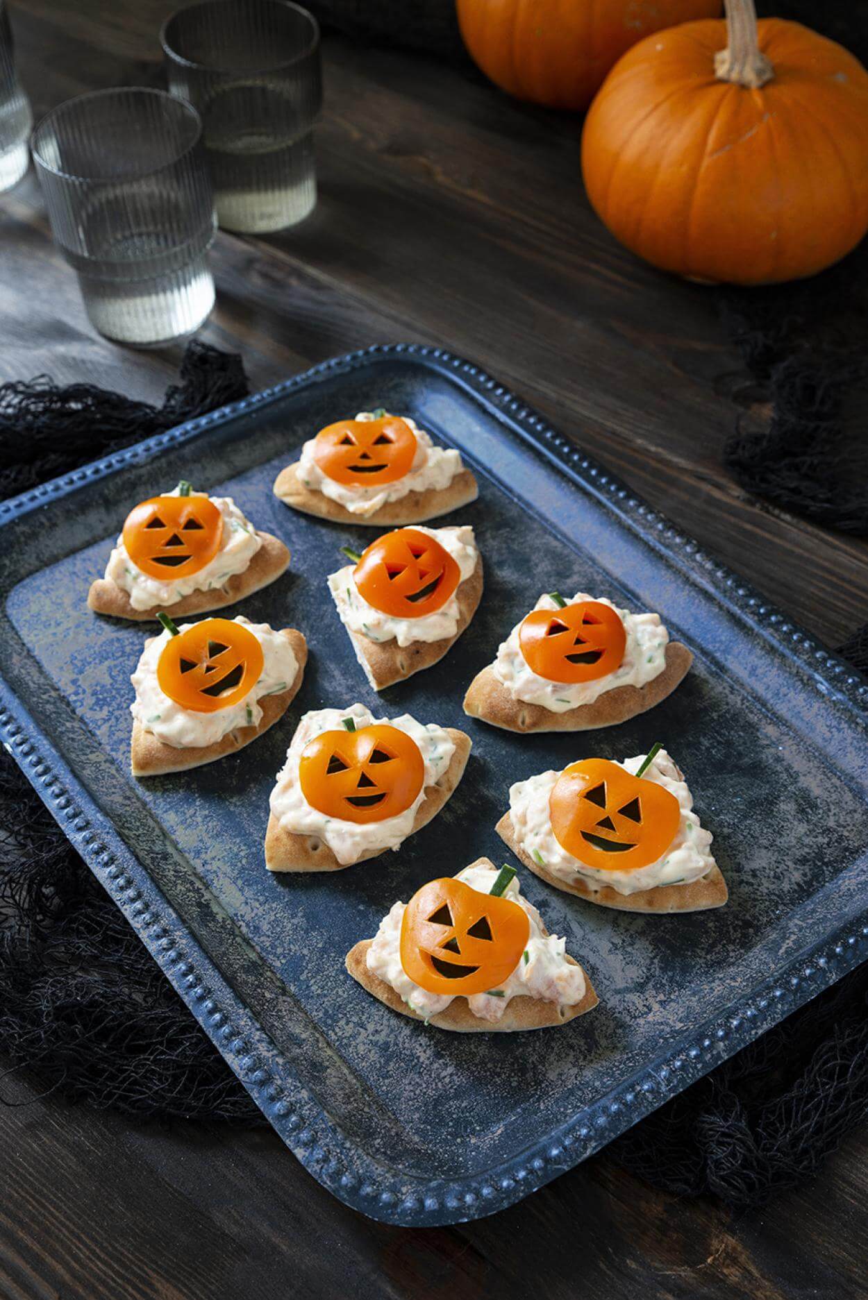 - Dekorera med paprika som skurits ut till små pumpor och lite gurkskal eller gräslök som kvist. Tips! Lägg lite gurkskal under paprikan så ser pumpan läskigare ut då ögon, näsa och mun framträder tydligare!