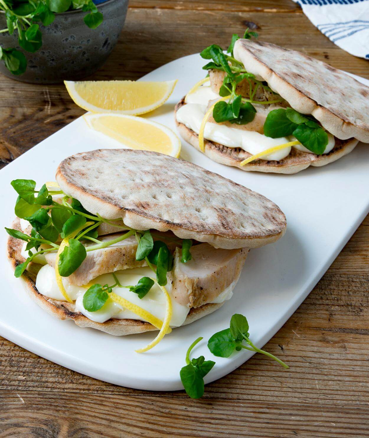 - Sprid ut majonnäsen över fyra brödskivor, toppa med kyckling och rikligt med vattenkrasse.