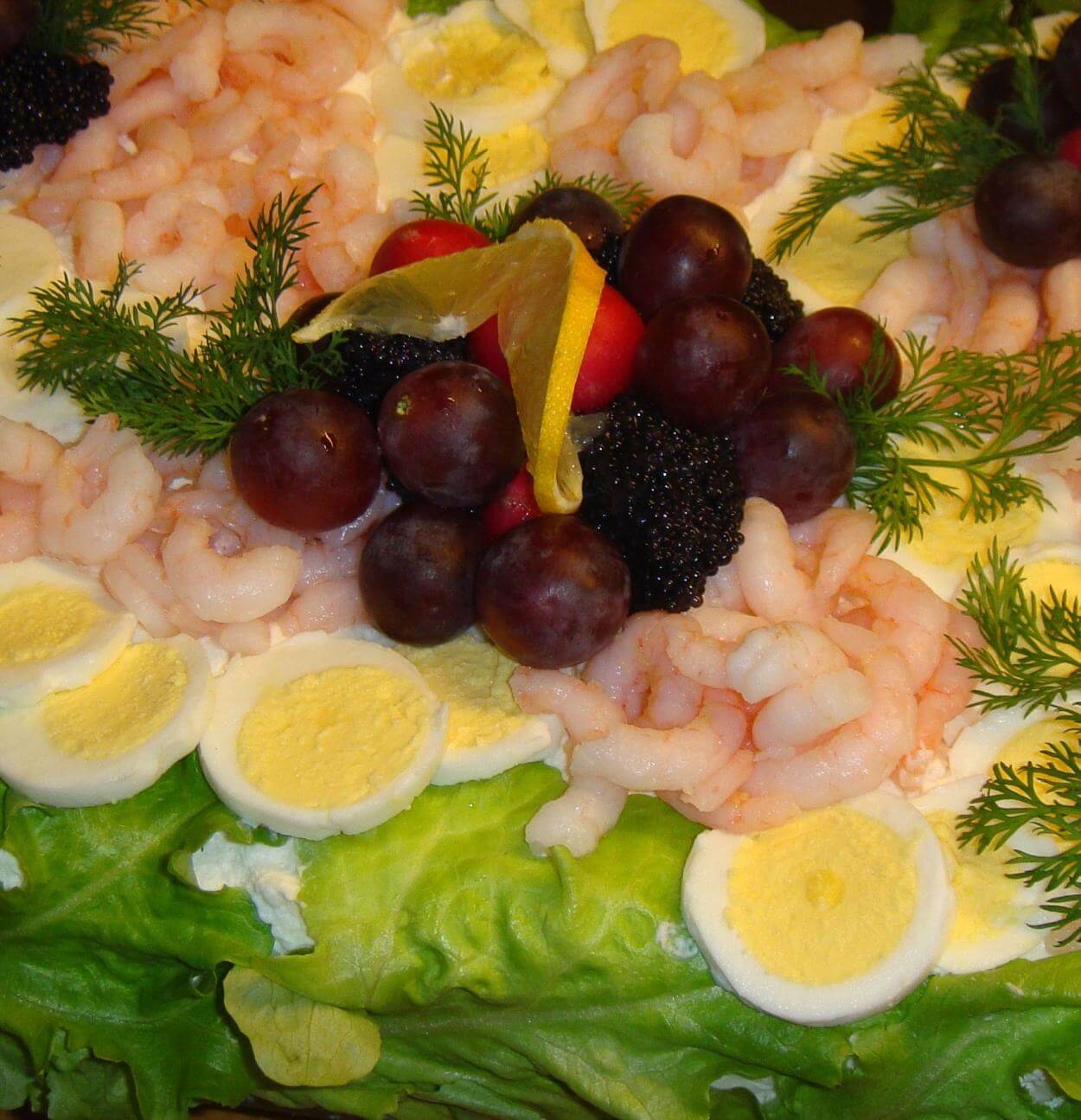- Bred tårtan med 3 dl hårt vispad grädde – klicka i Kalles Kaviar innan vispning. Dekorera tårtan med plocksallad på sidorna och 5 kokta skivade ägg samt färska skalade räkor. Garnera med skivad citron, skivad gurka, färsk dill, vindruvor och gärna löjrom!