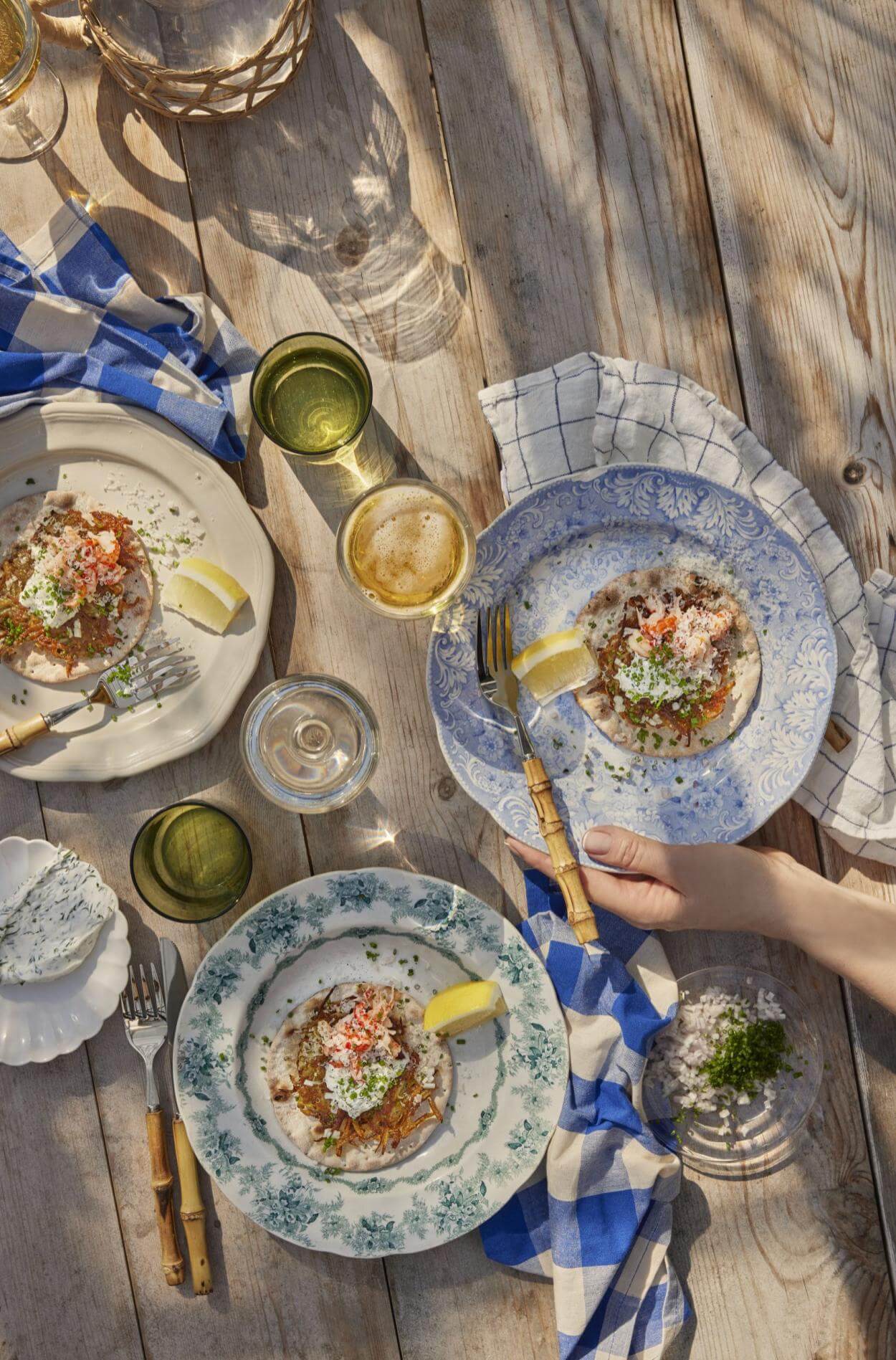 - Lägg en råraka på ett Polarknäcke, toppa med en klick dillcrème, kräftstjärtar och riv sedan över den lagrade osten och strö över lite finhackad gräslök.