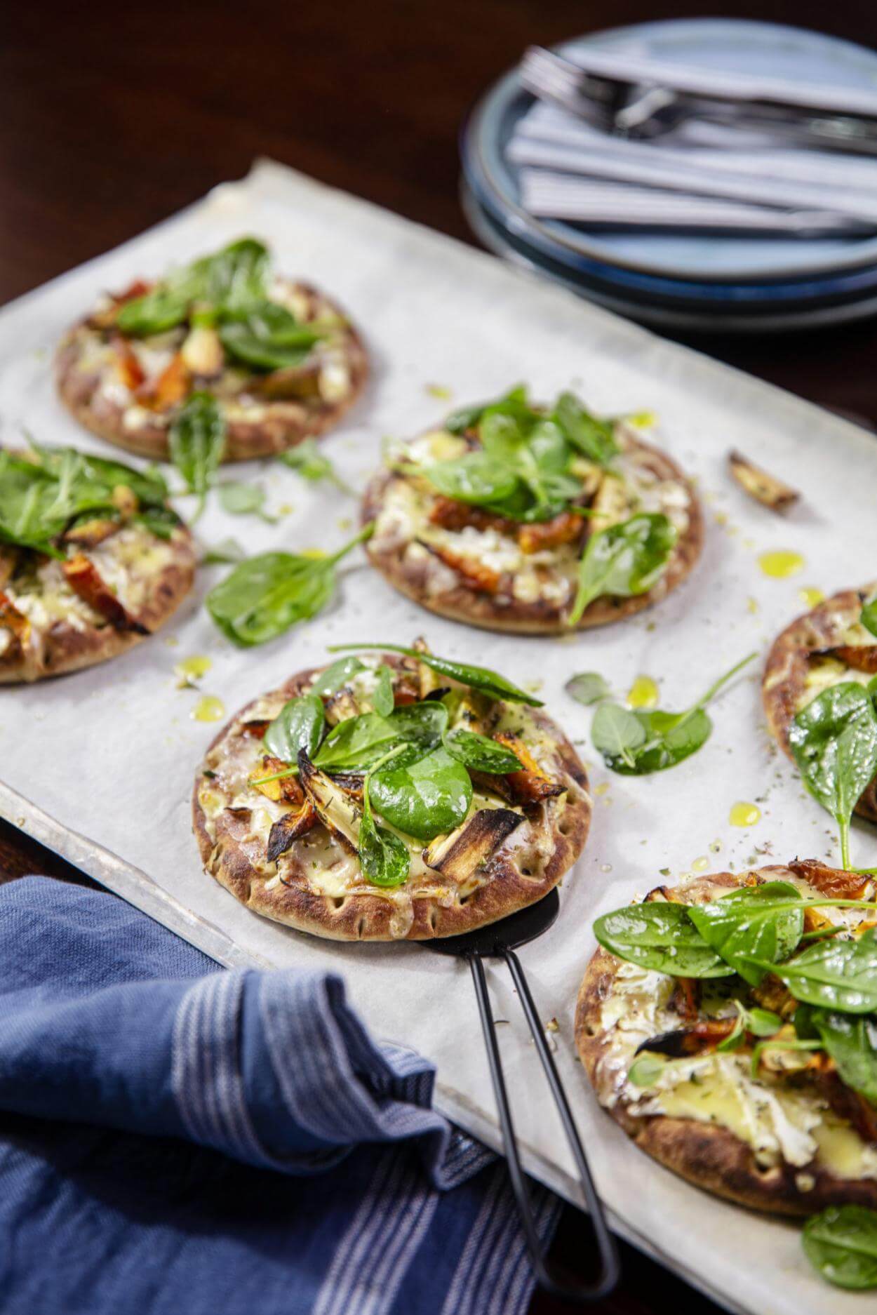- Vänd spenaten i dressingen och toppa pizzorna med spenat.