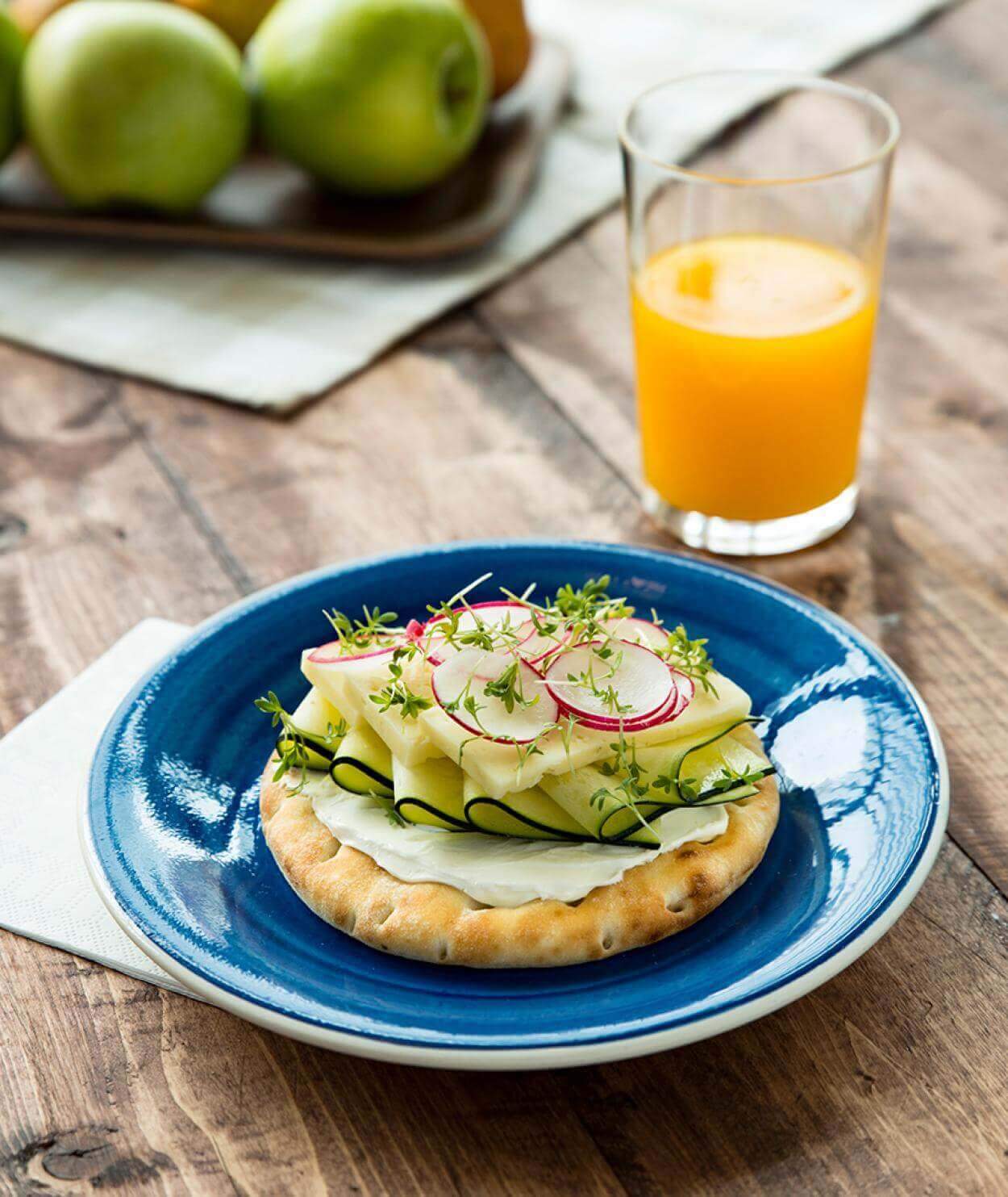 - Bred ut ett lager färskost på smörgåsarna. Fortsätt med zucchini, ost, skivade rädisor och klippt krasse på toppen.