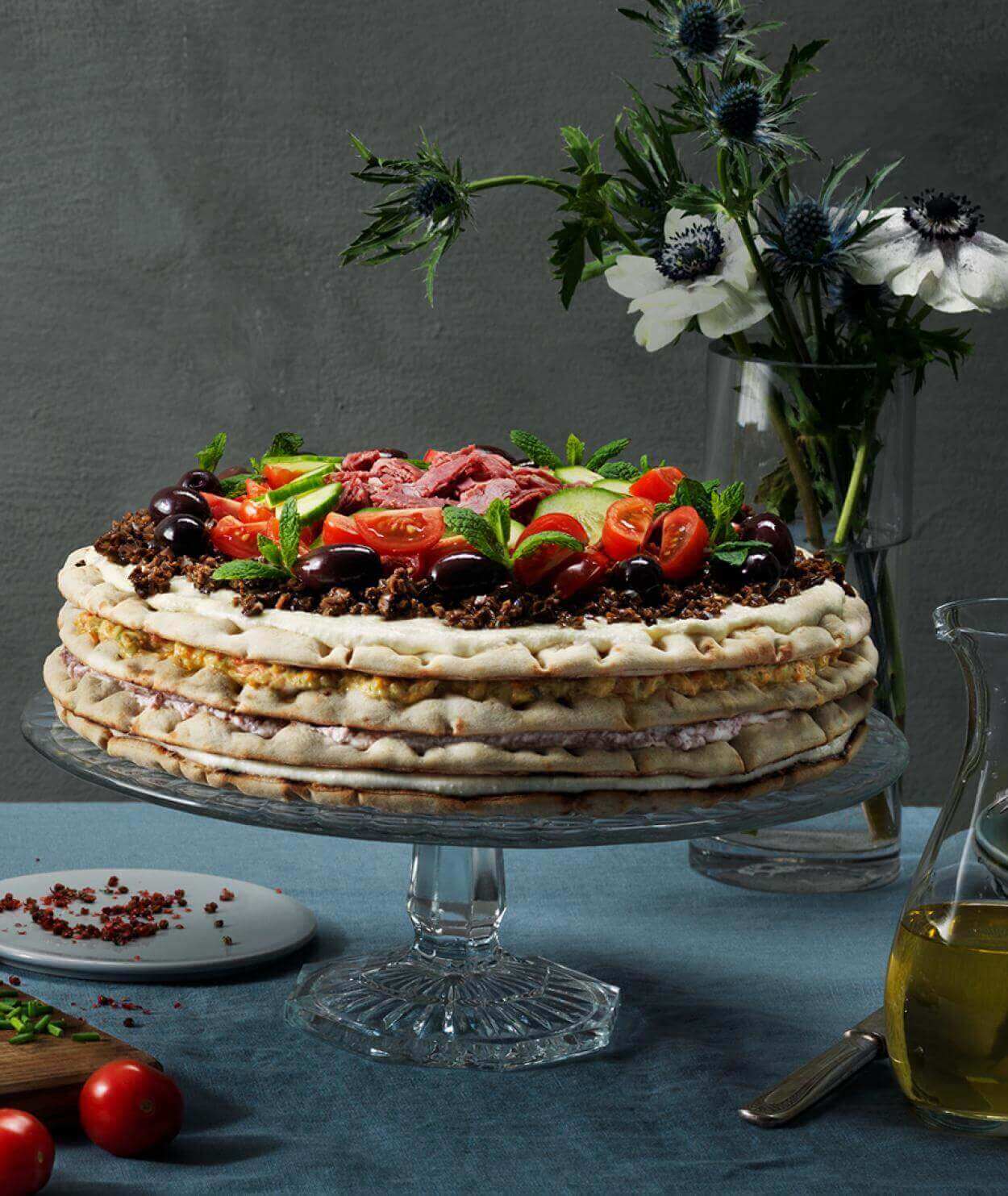 - Lägg en brödkaka på ett större fat el tårtfat. Bred halva mängden av fetaost/créme fraicheröran på brödkakan.