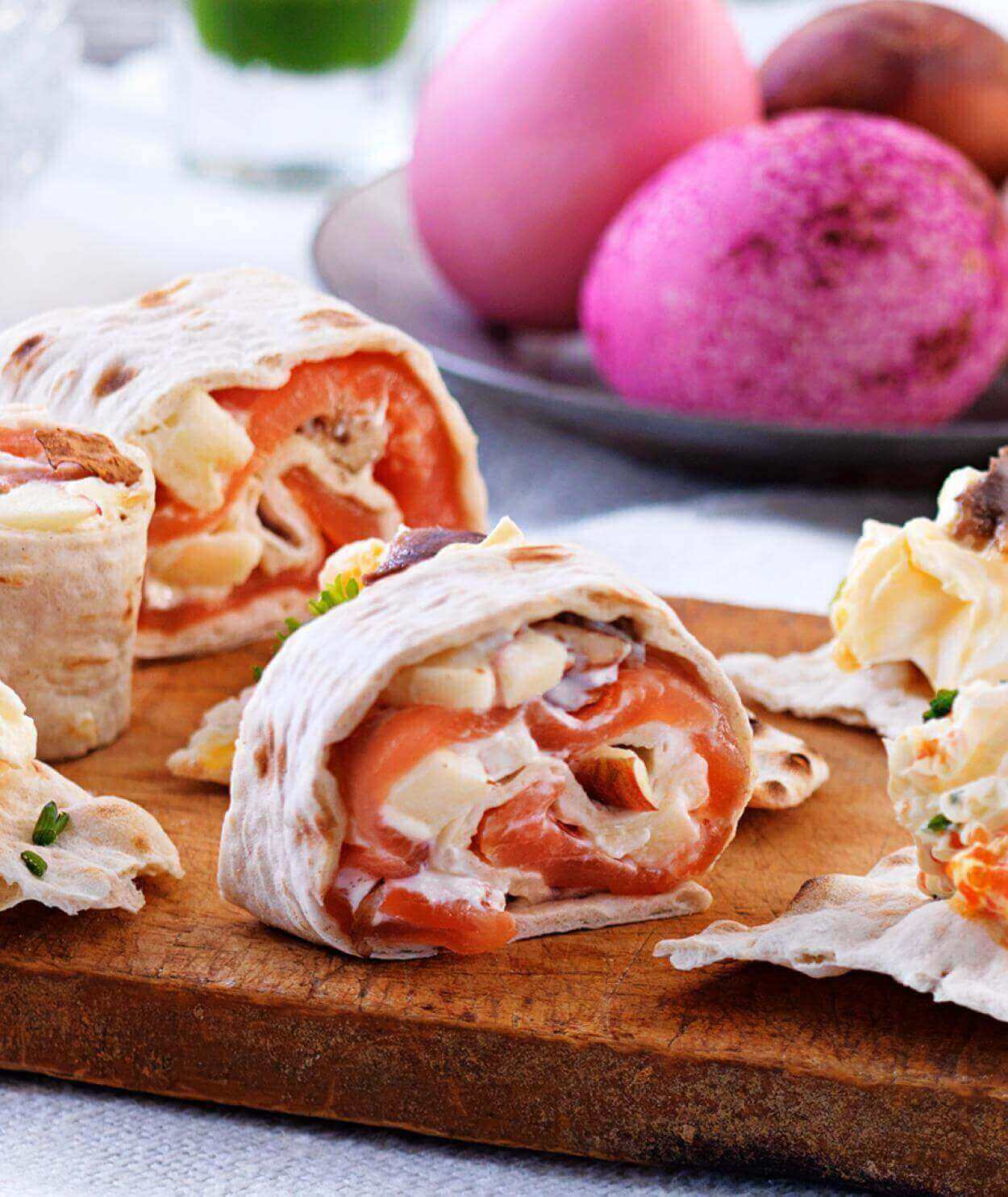 - Bred röran över brödet, strö ut valnötterna, lägg på laxen och rulla ihop till en rulle från långsidan.