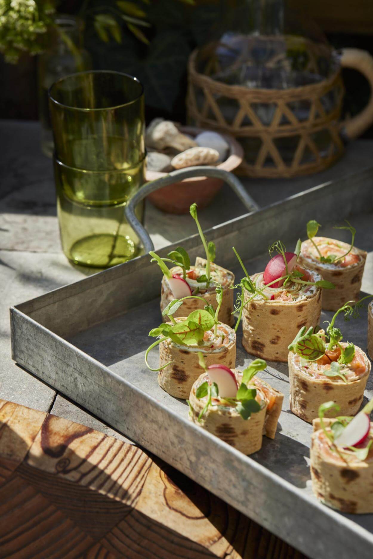 - Ställ snittarna på ett fat och toppa med färska örter, salladsskott och en bit rädisa.