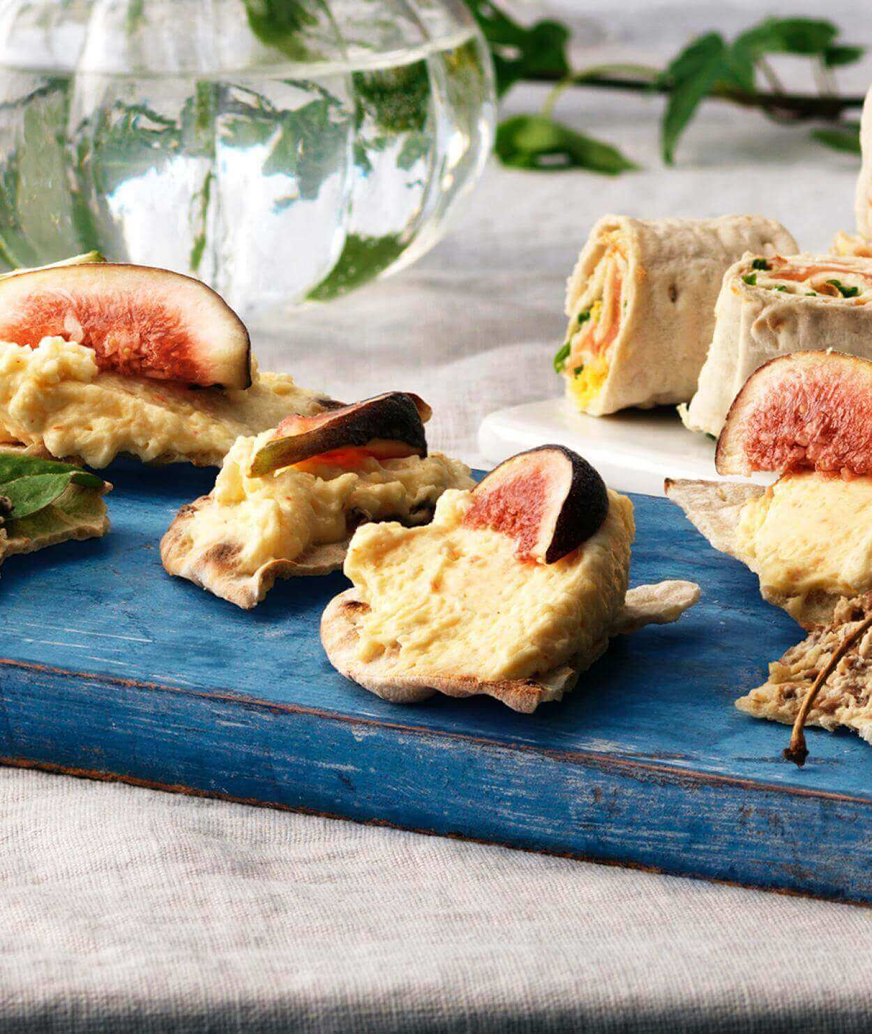 - Bryt brödet i mindre bitar och toppa med ost kräm och fikon som du har skurit i kvartar, alternativt en klick fikonmarmelad.