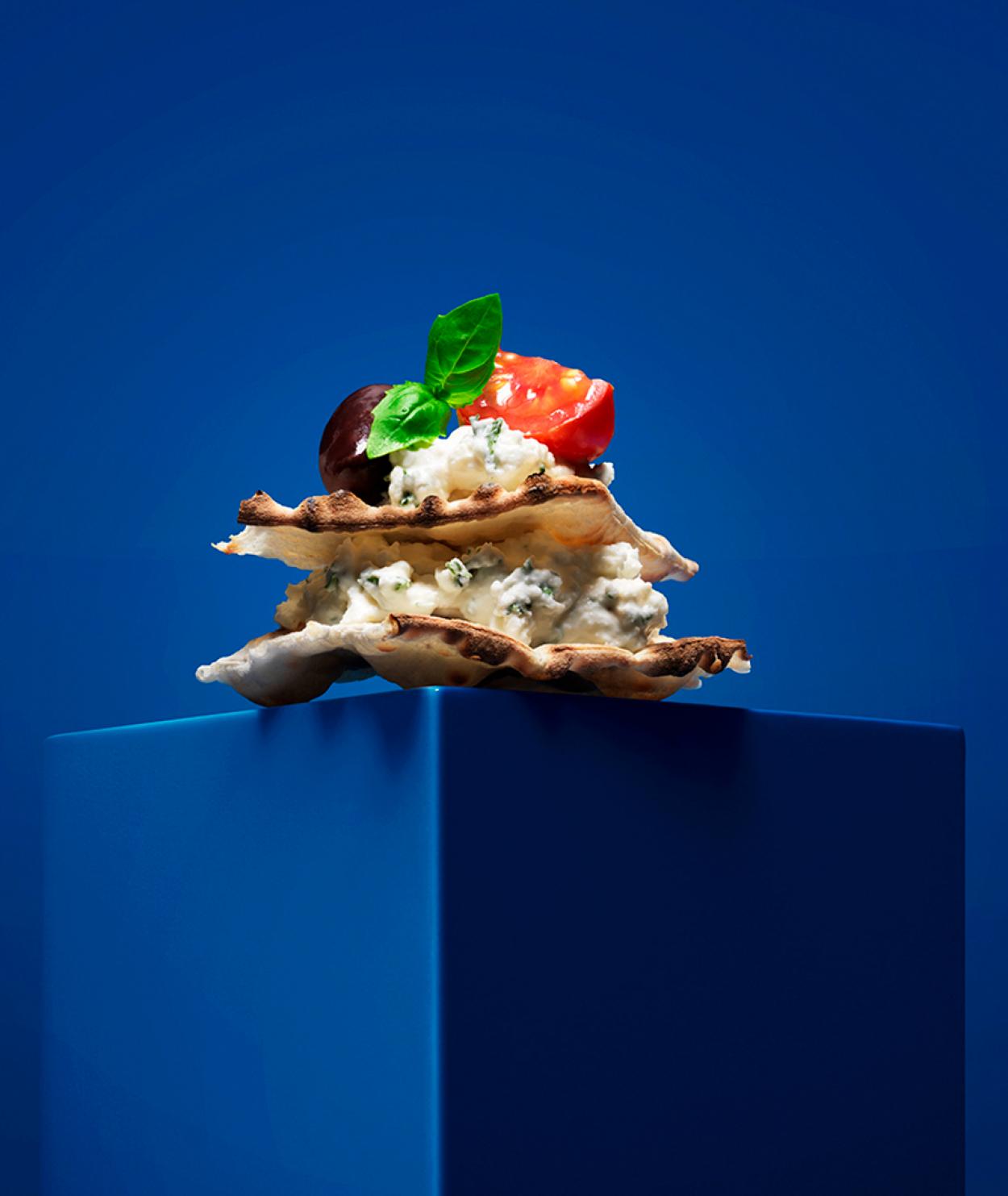 - Bryt Gene i bitar. Smula fetaost och blanda med créme fraiche, hackad basilika, salt och peppar. Garnera med körsbärstomat, svart oliv och basilikablad. Hjälten på plockbordet, helt enkelt.