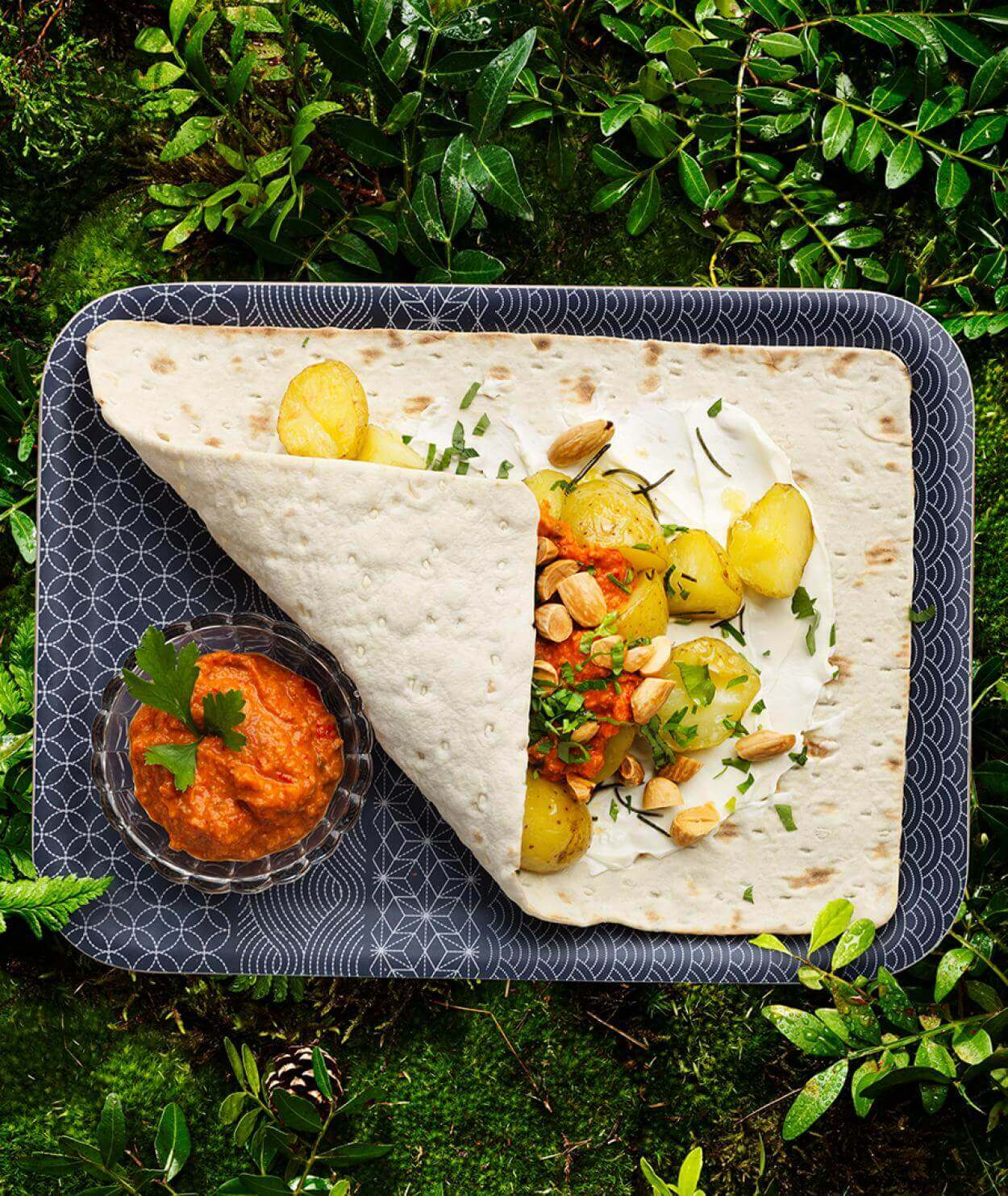 - Lägg på potatis och klicka på extra romescosås, toppa med finhackade örter.