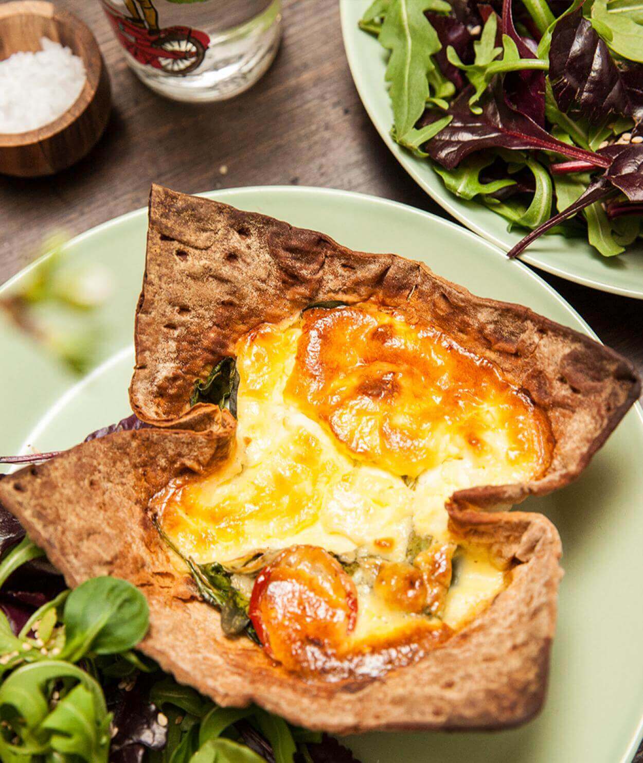 - Lägg en näve babyspenat och några tomater i varje pajform.