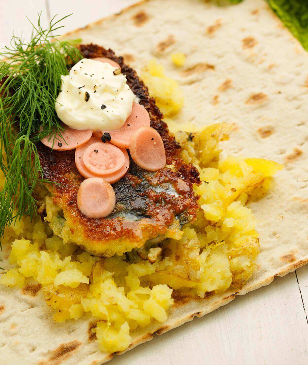 Strömmingswraps – serveras med potatisstomp och picklade rädisor