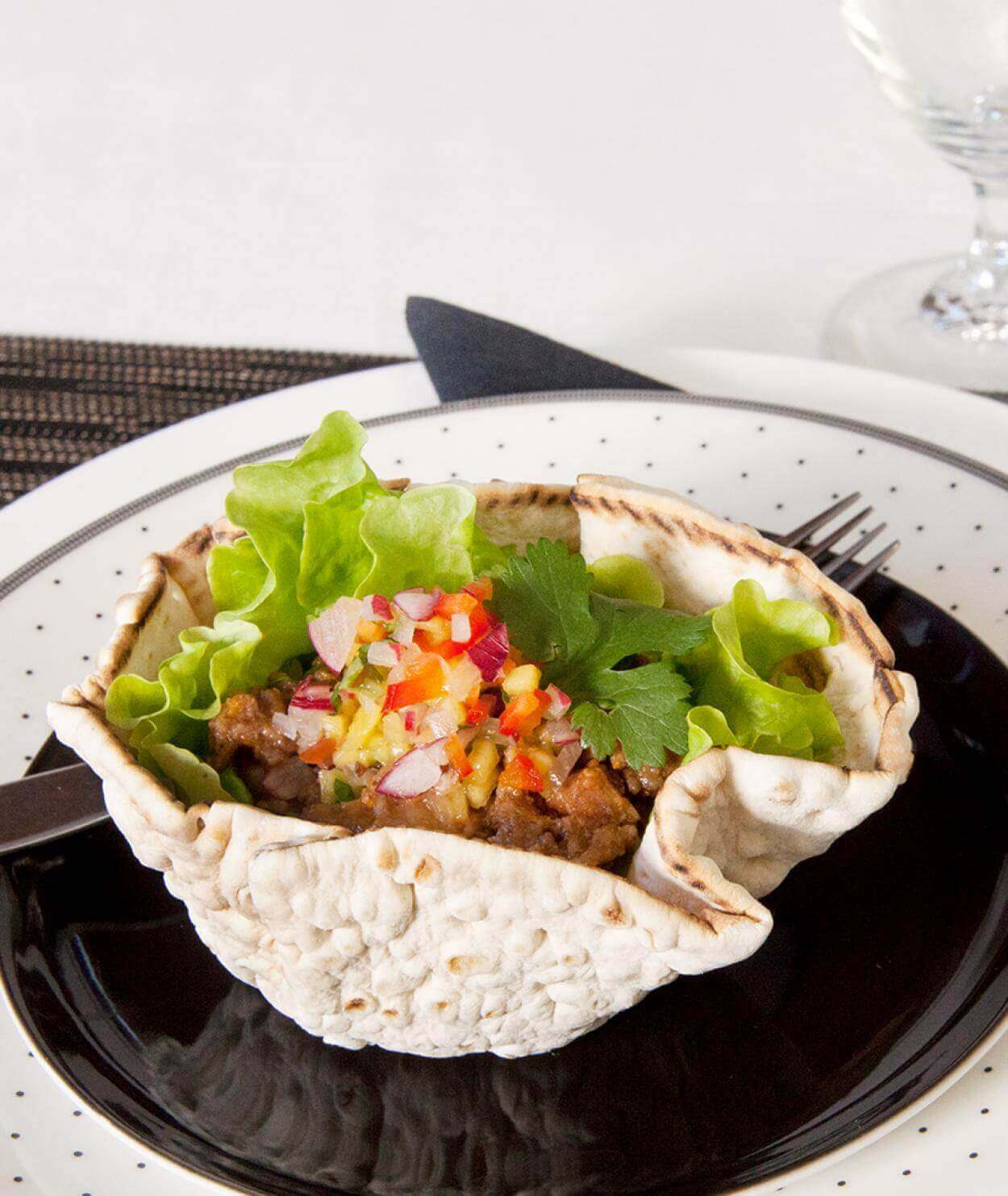 - Lägg salladsblad i brödkorgarna och fyll med köttfärsröran.