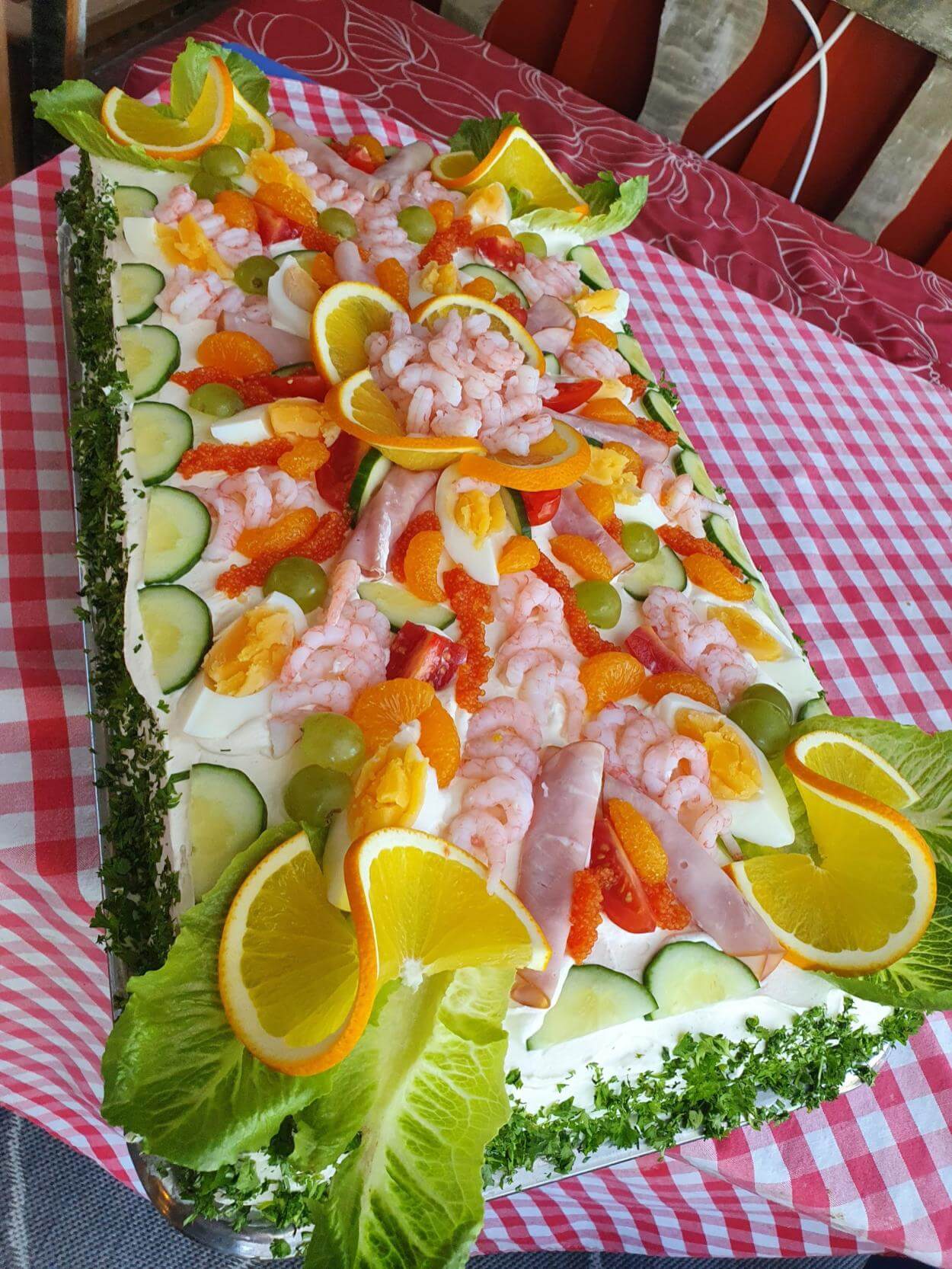 - Hacka bladpersilja och klä sidorna med det. Alternativt smulat smördegsflarn Garnera tårtan som du vill, till exempel med sallad, räkor, ost, vindruvor, svart kaviar, apelsinskivor, citronskivor, syltade mandarinklyftor, gurka och körsbärstomat.
