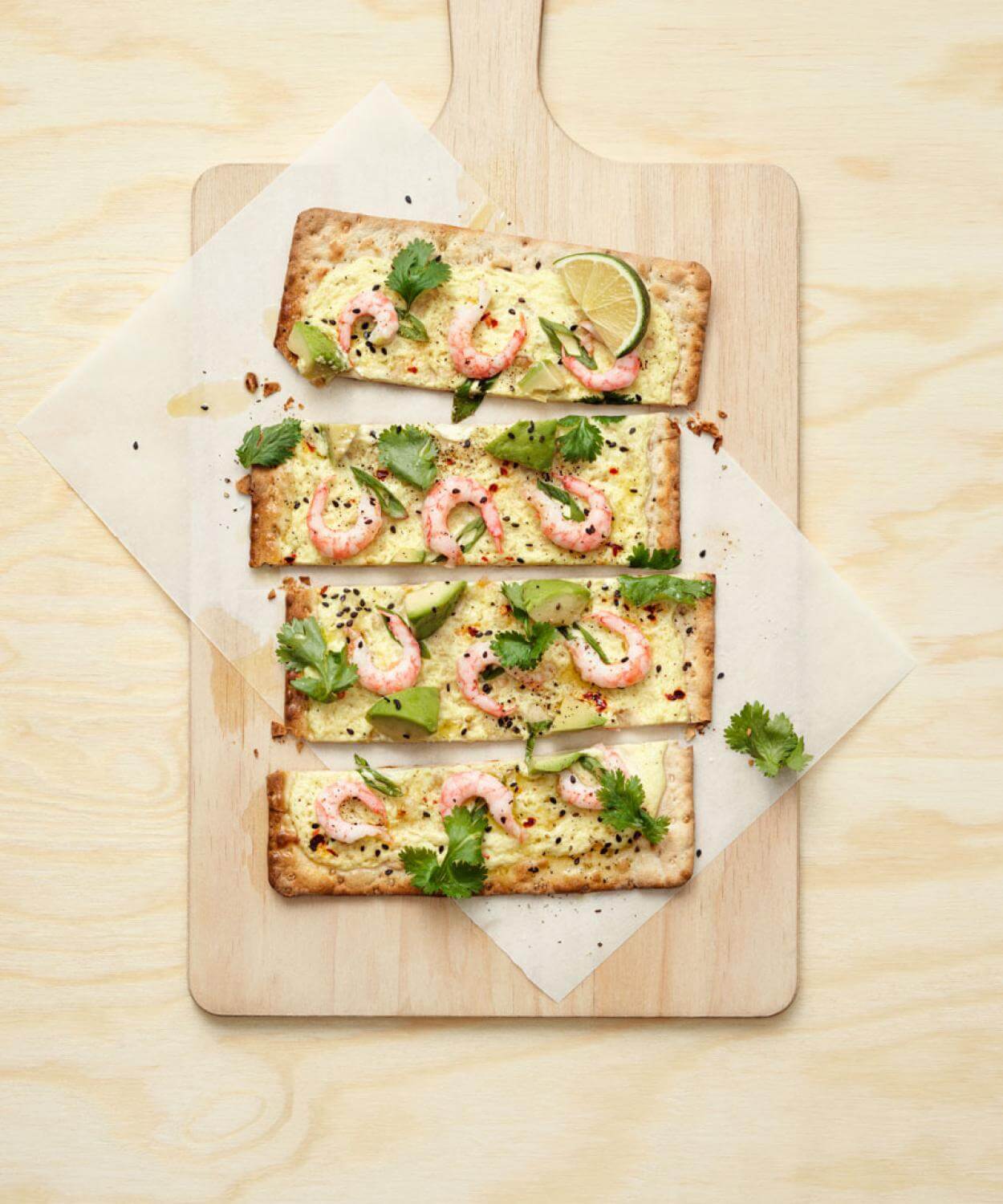 God som en pizza, lika fräsch som en sallad. Här får lyxiga räkor samspela med sina smakkamrater aioli och avokado, men får också en modern asiatisk touch av koriander, svarta sesamfrön och lime.