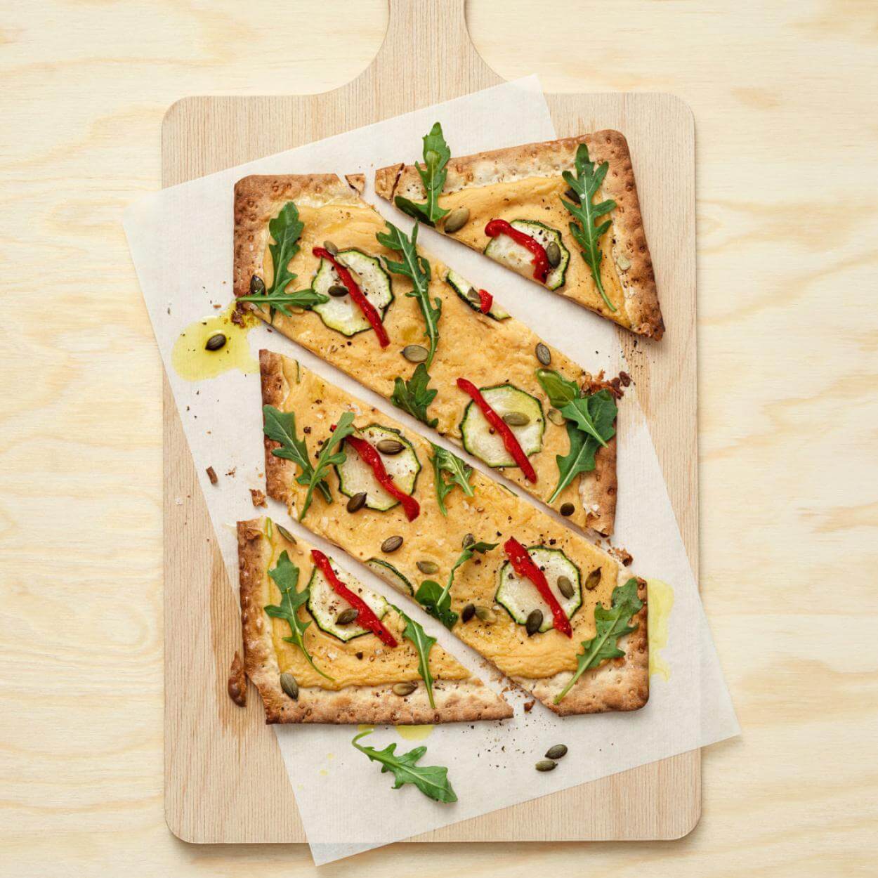 Veggivore är pizzan för alla finsmakare! Spreaden är naturell hummus som fått extra sting av lite srirachasås. Mötet mellan zucchinin, den grillade paprikan och crunchiga, rostade pumpafrön gör smaklökarna lyckliga. Pizzan är vegansk.