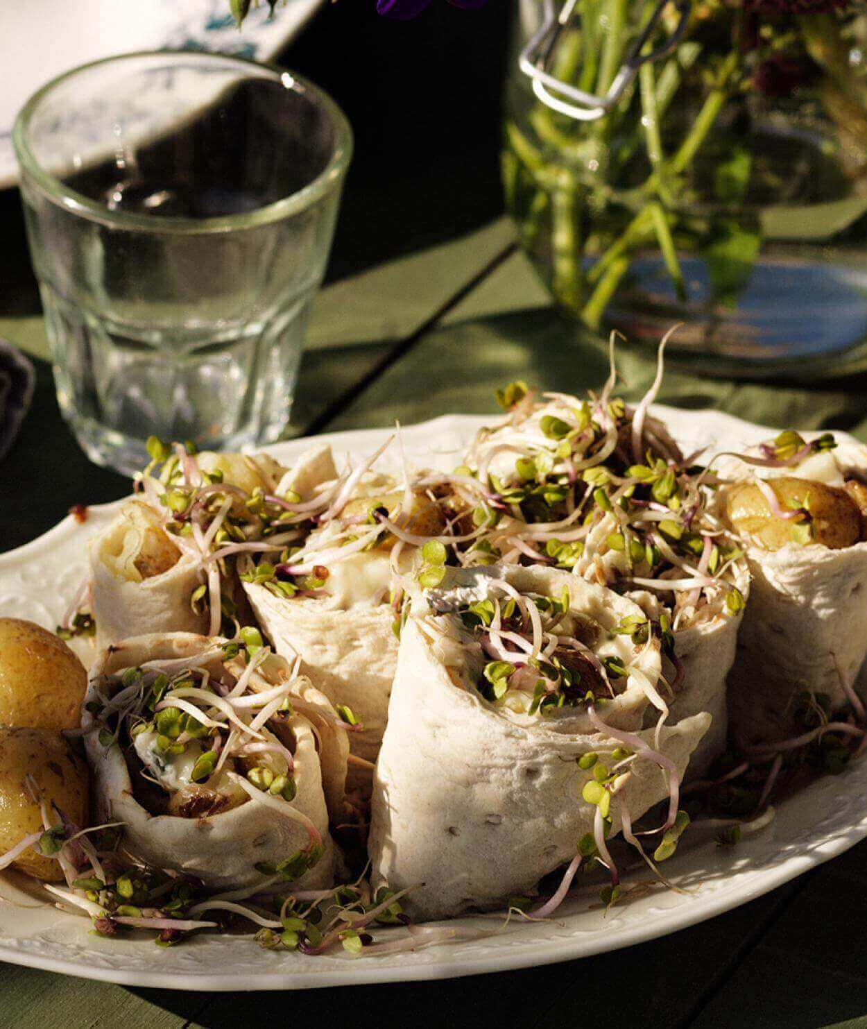 - Smöra brödskivorna och fördela salladsblad ovanpå, skiva kokt potatis och lägg över (eller använd små hela färskpotatisar), strö över lök och sill. Rulla ihop och skär i snittar. Dekorera med groddar.