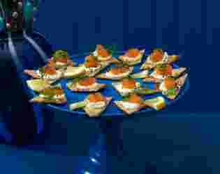 Snittar med rökt lax, ört- och kapriskräm och inlagd gurka