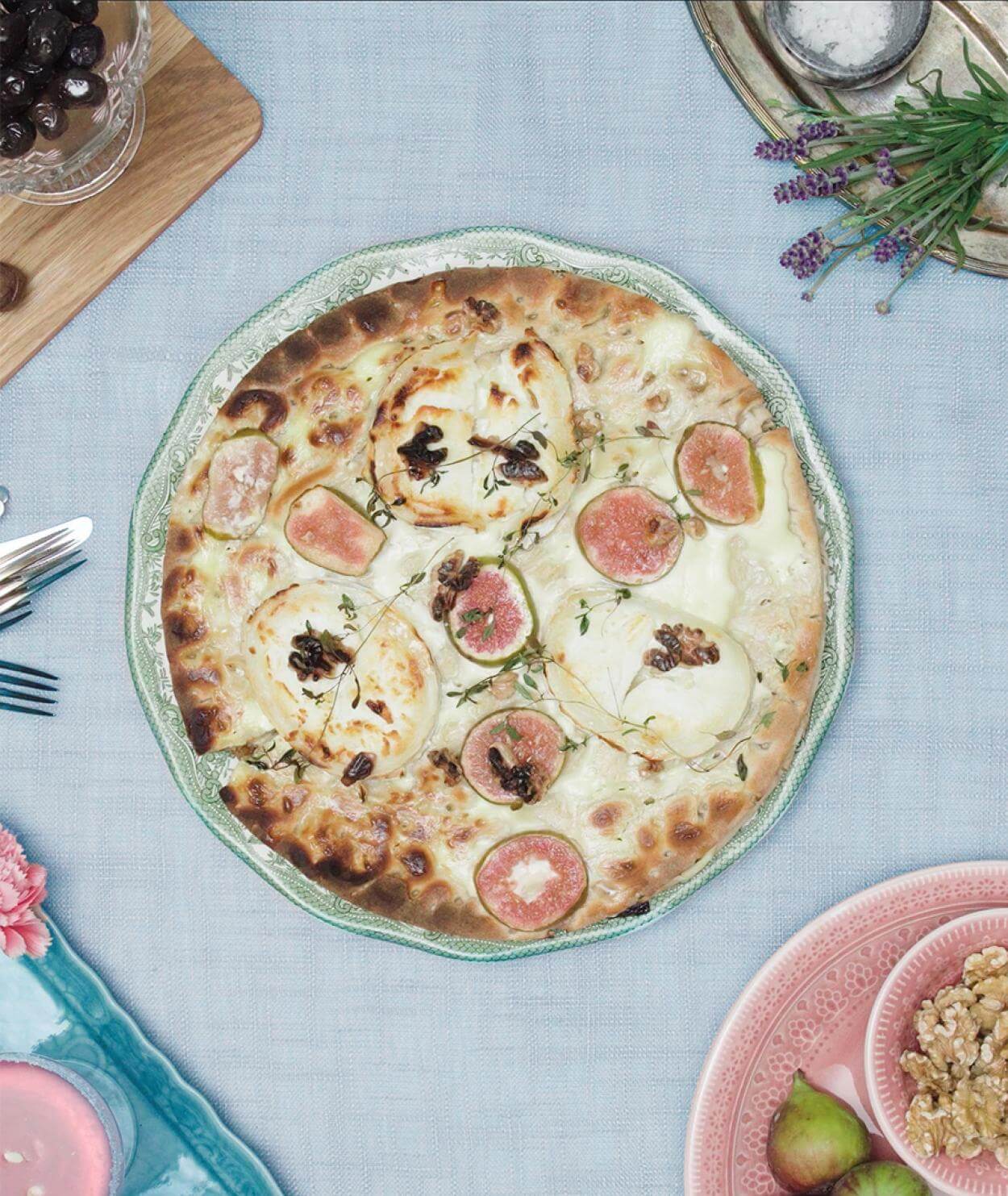 - Lägg på ett bröd till och bred på creme fraiche. Lägg på skivor av getost, skivor av fikon och valnötter. Ringla över honung.