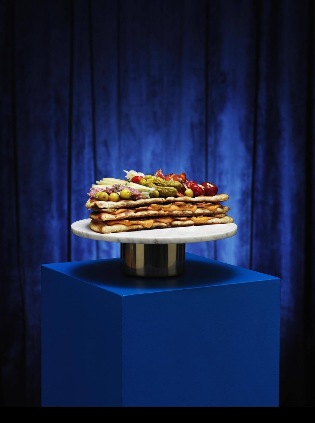- Lägg på det sista brödet och dekorera med alla härliga ingredienser till toppingen; skivor av salami, serranoskinka, manchegoost, oliver, banderillas samt fyllda paprikor efter tycke och smak. Det går även att lägga all topping på ett separat fat. Servera direkt.