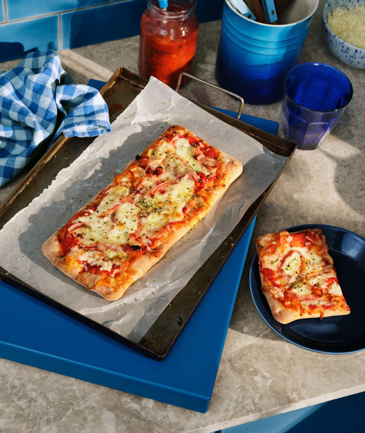 - Lägg brödet på ett bakplåtspapper på en plåt. Bred på tomatsåsen, lägg ut skinkan och strö över osten.