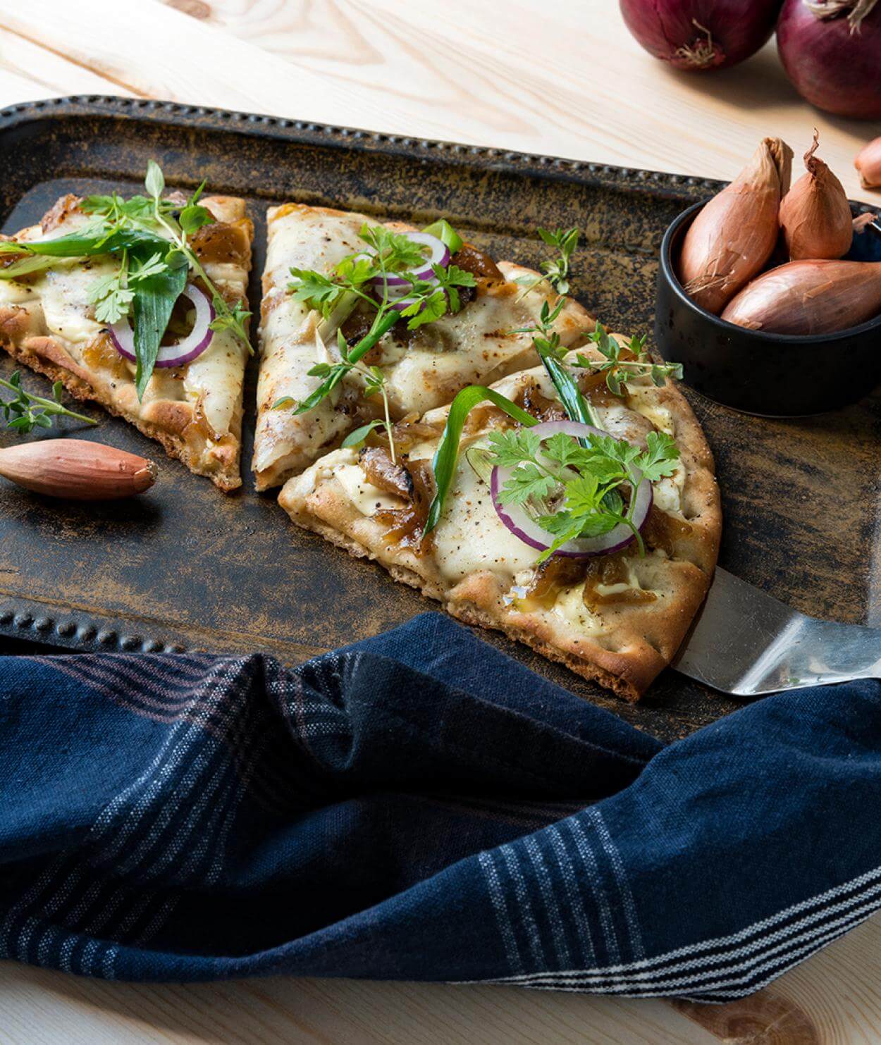 - Bred brödskivorna med creme fraiche och toppa med den avsvalnade löken samt smulad mozzarella.