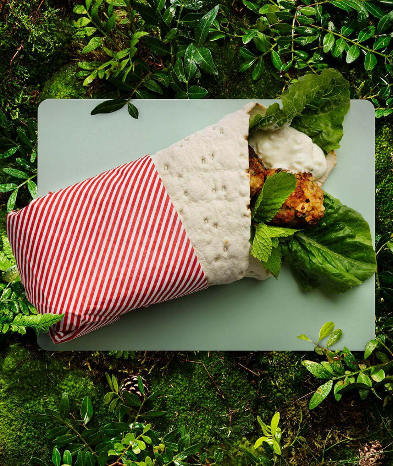 - Lägg på ett par salladsblad, köttbullar och mynta, vik ihop till wraps och klicka på resten av fetaostkrämen.