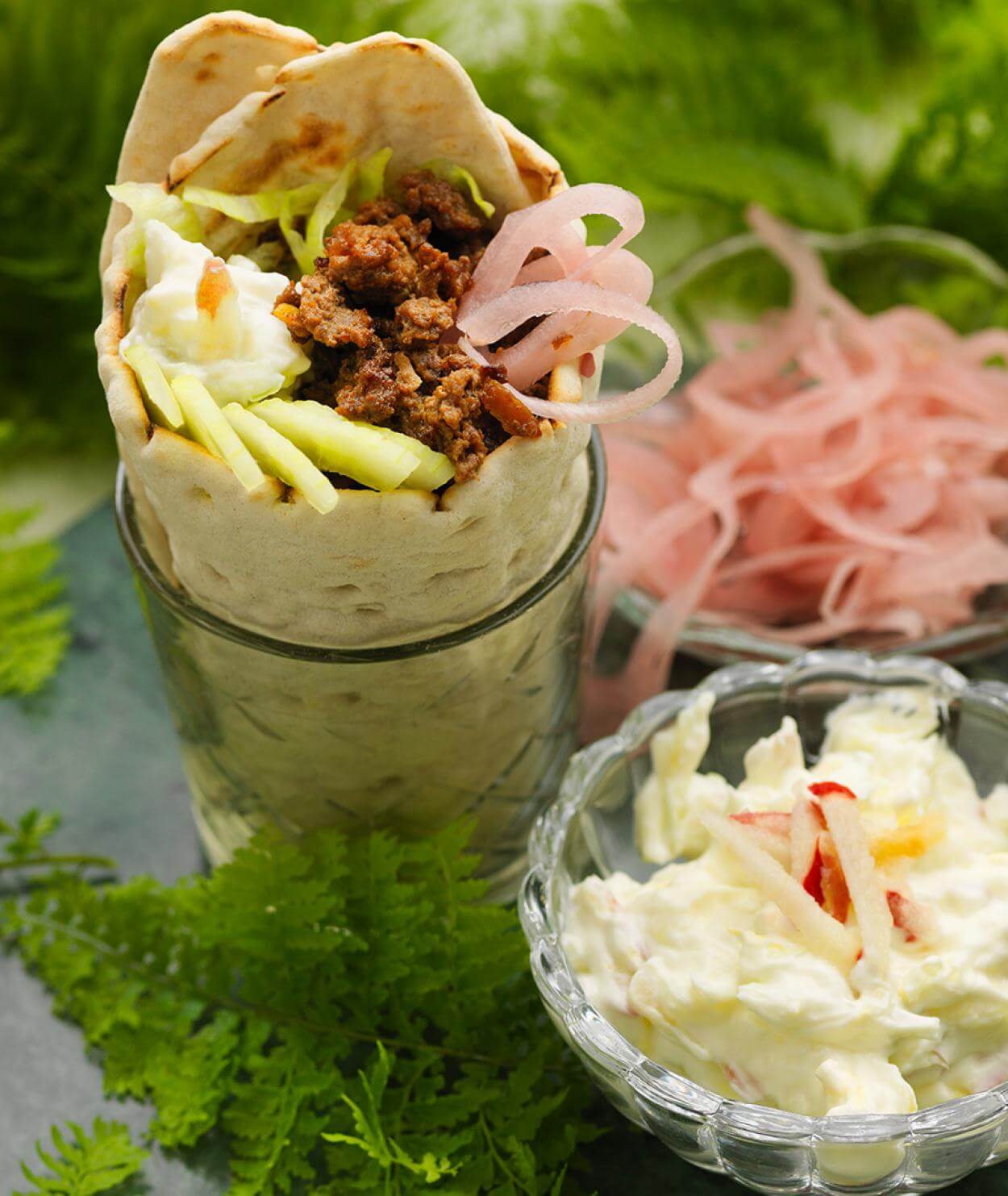 Wrap med renskavskebab – serveras med äppelraita och picklad rödlök